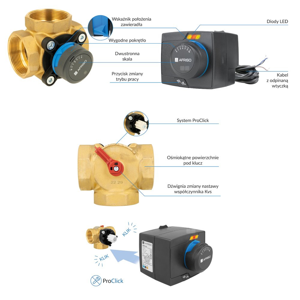 Urządzenia wyposażone w system ProClick – pozwala na bezpośredni montaż siłownika na zaworze bez użycia dodatkowych narzędzi.