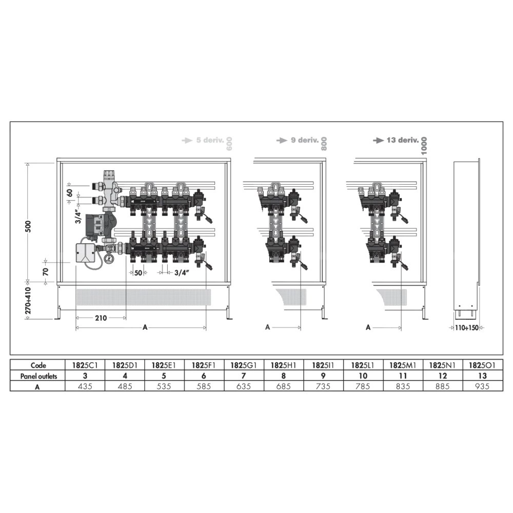 Zespół regulacyjny – regulacja stałotemperaturowa. Wstępnie zmontowany w skrzynce inspekcyjnej W zestawie: - termostatyczny układ regulacji; - para rozdzielaczy z kompozytu z wbudowanymi przepływomierzami i zaworami odcinającymi; - termostat bezpieczeństwa; - wysokowydajna pompa UPM3 Auto L 25-70; - skrzynka inspekcyjna naścienna ze wspornikami podłogowymi. Przyłącze: G 3/4" A (ISO 228-1) GZ, Podłączenie do złączek Caleffi. przyłącza wylot: G 3/4" A (ISO 228-1) GZ, 3 wyjścia. Maksymalne ciśnienie pracy: 6 bar. Zakres regulacji temperatury: 25–55 °C. Zasilanie elektryczne: 230 V (AC). Szerokość: 600.