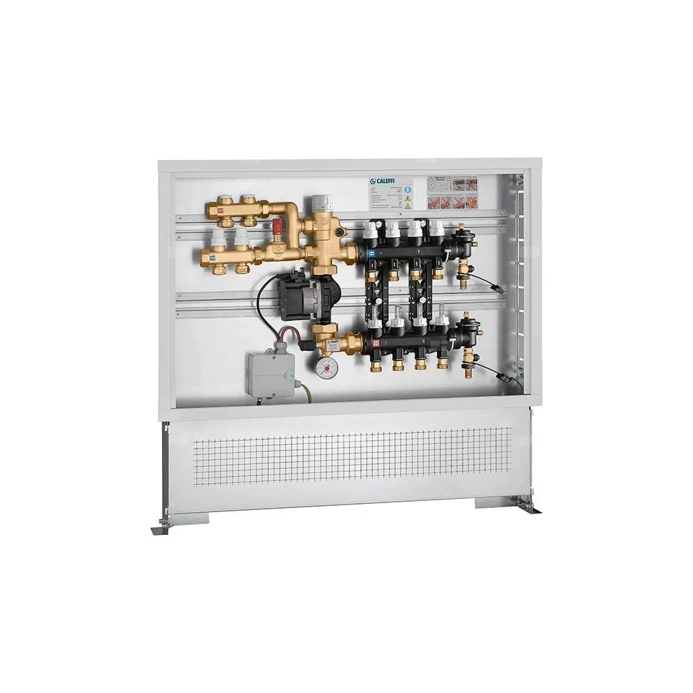 Zespół regulacyjny - regulacja stałotemperaturowa. Wstępnie zmontowany w skrzynce inspekcyjnej. Dodatkowy rozdzielacz obiegu pierwotnego. W komplecie: - termostatyczny ukłąd regulacji; - para rozdzielaczy z zaworami regulacyjnymi i zaworami odcinającymi obiegu pierwotnego; - para rozdzielaczy z kompozytu z wbudowanymi przepływomierzami i zaworami odcinającymi; - zestaw obejściowy obiegu pierwotnego; - termostat bezpieczeństwa; - wysokowydajna pompa UPM3 Auto L 25-70; - skrzynka inspekcyjna naścienna ze wspornikami podłogowymi. Przyłącze: G 1" (ISO 228-1) GW, Podłączenie do złączek Caleffi. przyłącza wylot: G 3/4" A (ISO 228-1) GZ, 3 wyjścia. podłączenie obieg pierwotny: G 3/4" A (ISO 228-1) GZ, 2 wyjścia. Maksymalne ciśnienie pracy: 6 bar. Zakres regulacji temperatury: 25–55 °C. Zasilanie elektryczne: 230 V (AC). Szerokość: 800.