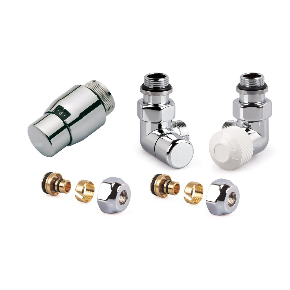 Zestaw CHROM do grzejników bocznozasilanych: głowica Thera-200 (chrom/chrom) T4221 + Zawór termostatyczny, chrom, narożny, prawy, 1/2" V2082RSL15A + zawór powrotny narożny, lewy, 1/2" V2482L0015A + 2x złączka do rur wielowarstwowych FEM24M16X2