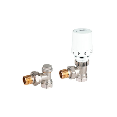 Zestaw do grzejników bocznozasilanych: głowica T5019 + zaw. termostatyczny kątowy V2020ESX15 + zaw. powrotny kątowy V2420E0015, 1/2"