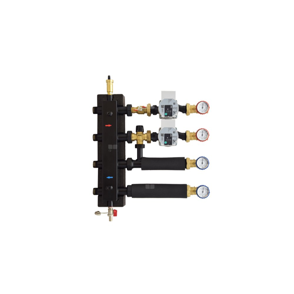 Parametry techniczne: system do 40kW, możliwość podłączenia 2 źródeł ciepła, kvs zaworu termostatycznego 3,4.
