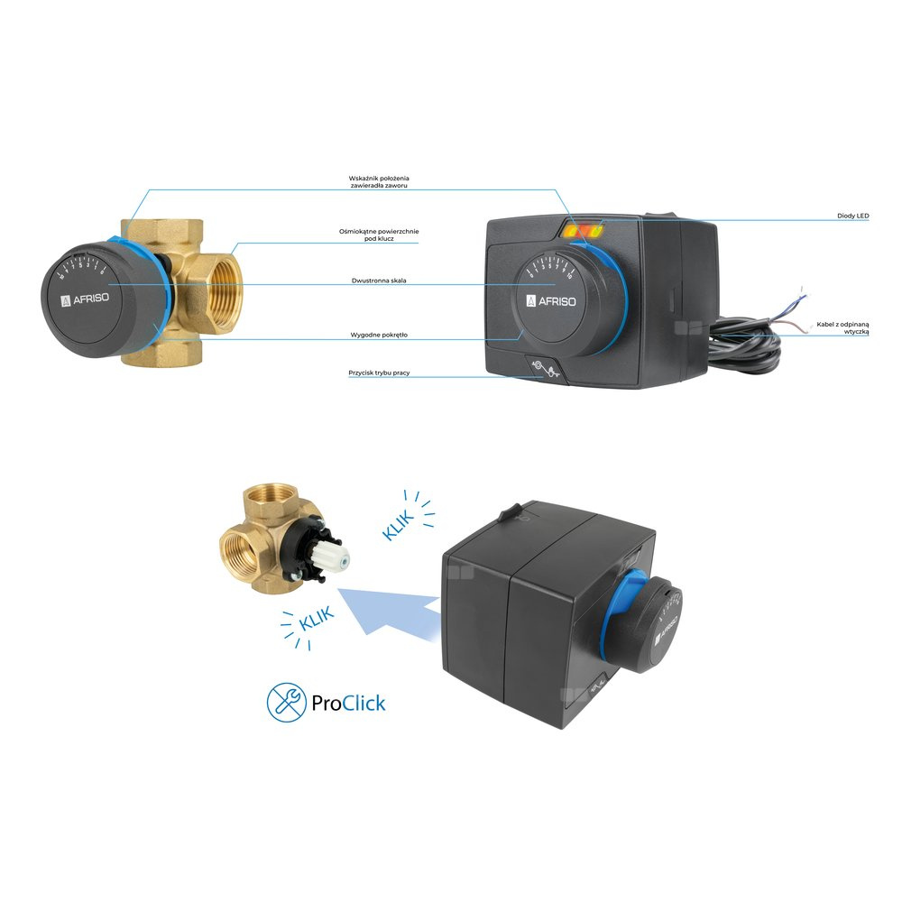 Urządzenia wyposażone w system ProClick – pozwala na bezpośredni montaż siłownika na zaworze bez użycia dodatkowych narzędzi.