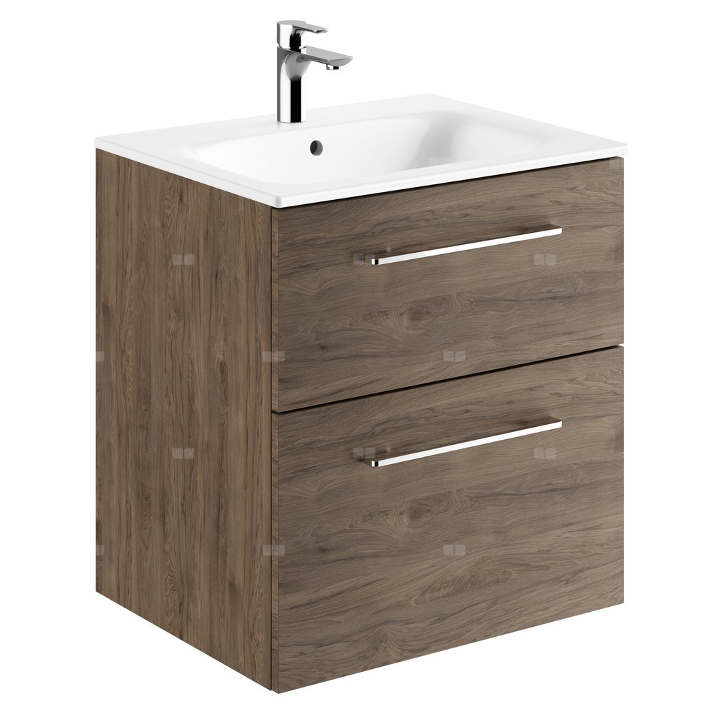 Zestaw umywalki meblowej Geberit Selnova Square, slim rim, z szafką pod umywalkę, z dwoma szufladami: B1=58.8cm, T=50.2cm, Otwór na baterię=Na środku, Przelew=Widoczny, Orzech włoski hickory