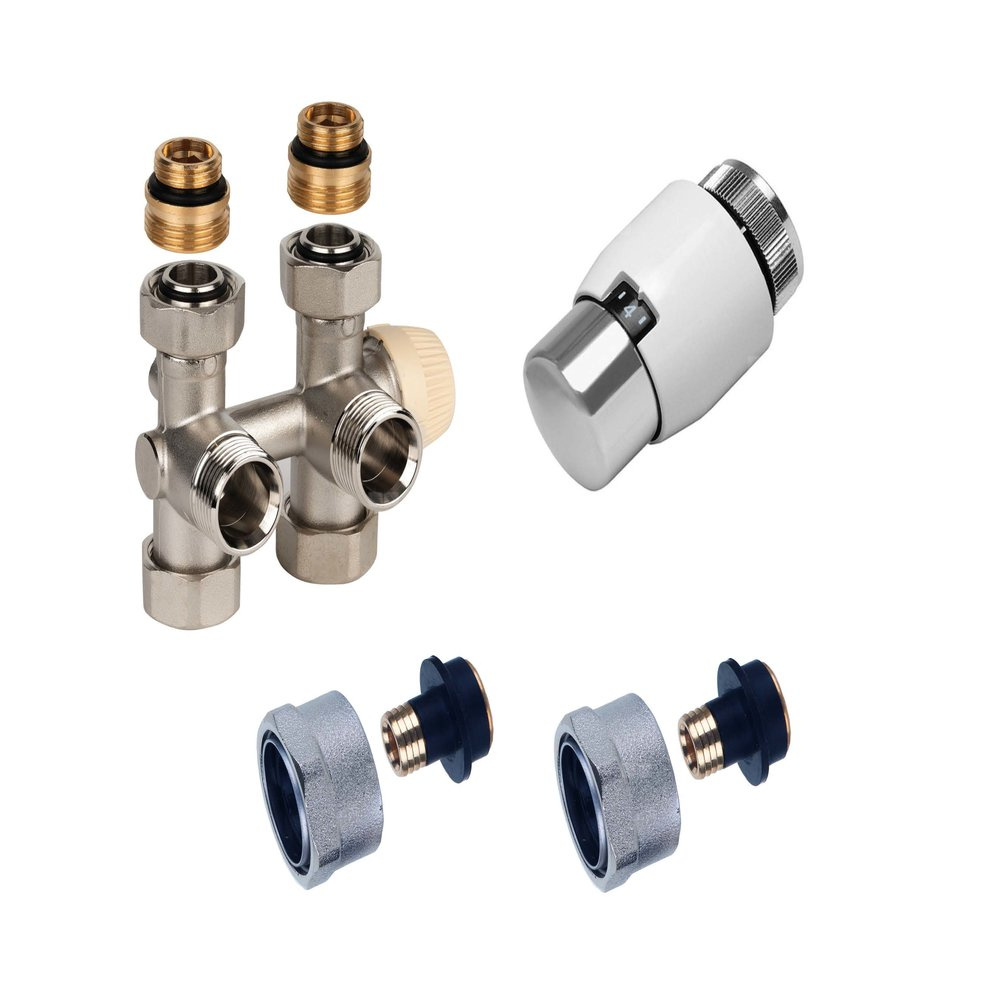2. Zawór podwójny Therafix Universal, kolor biały, typ przyłącza grzejnika 3/4” gw. zewn., z Euroconus
